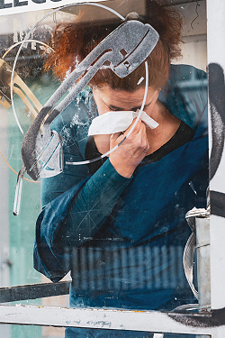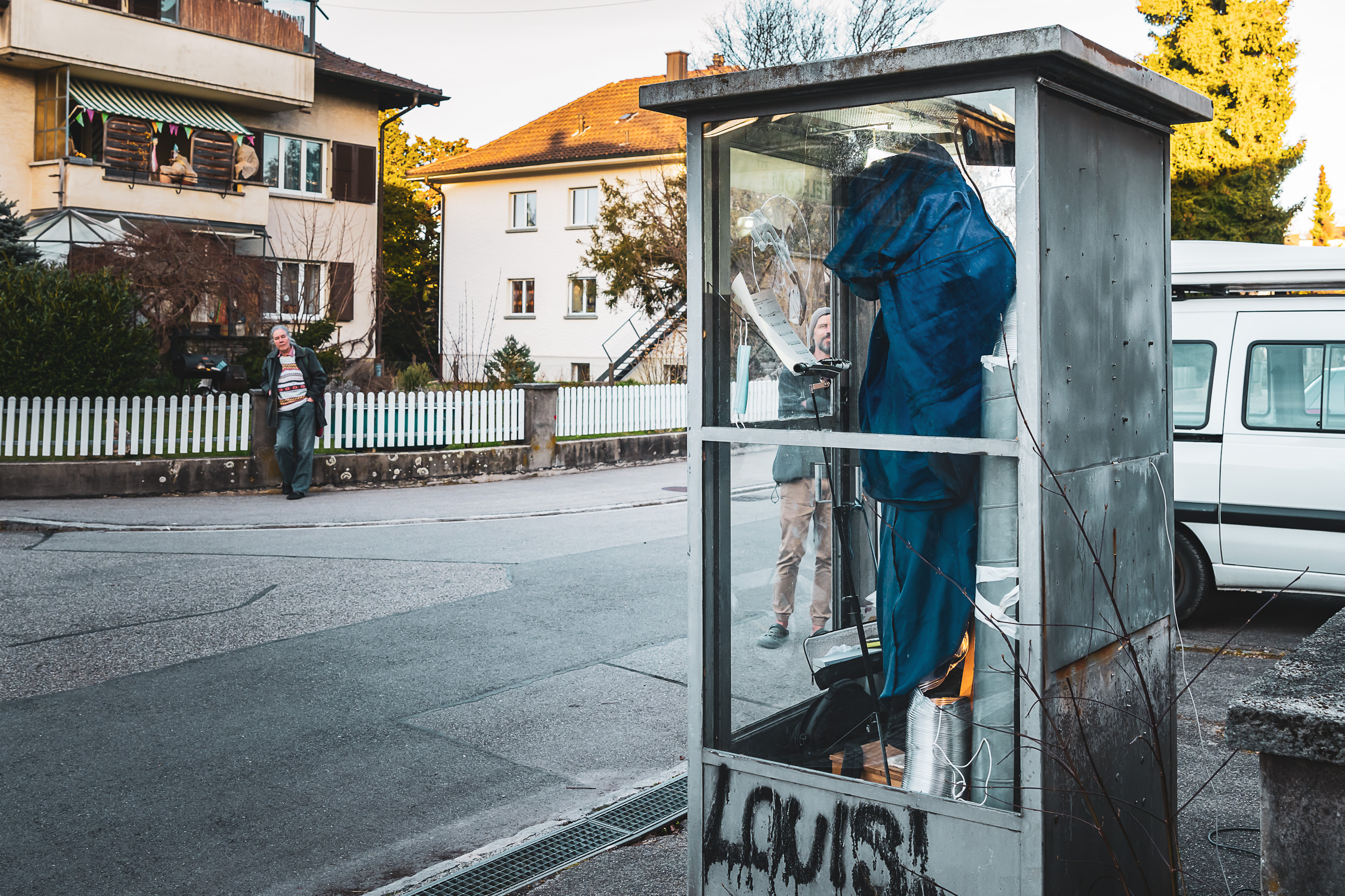 Als Publikumsmitglied wirst du nun eingeladen, den Atem der Flötistin zu spüren, sowie die Vibrationen der Soundinstallation, von der du ein Teil bist. Aber setz zuerst deine Maske auf. Und halte einen 4-Meter Sicherheitsabstand von der Musik Luft, die aus der Flöte strömt. Das Ensemble trifft dieses Social-Distancing-Wesen und bemüht sich um eine gegenseitige Verständigung: Die Live- (offline) Aufführung kann stattfinden, aber nicht in einer schwarzen Kiste. Ihr könnt proben, aber nicht miteinander am selben Ort. Es ist OK, draussen aufzutreten, aber haltet zu den anderen Darstellern sowie zum Publikum den entsprechend Abstand. Dann geht wieder schnell hinein. Wir haben ja Winter.