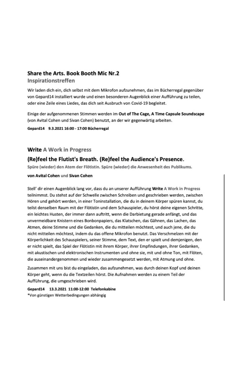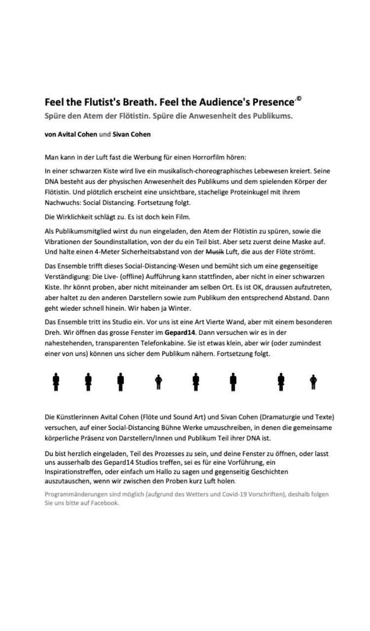 Die Künstlerinnen Avital Cohen (Flöte und Sound Art) und Sivan Cohen (Dramaturgie und Texte) versuchen, auf einer Social-Distancing Bühne Werke umzuschreiben, in denen die gemeinsame körperliche Präsenz von Darstellern/Innen und Publikum Teil ihrer DNA ist.