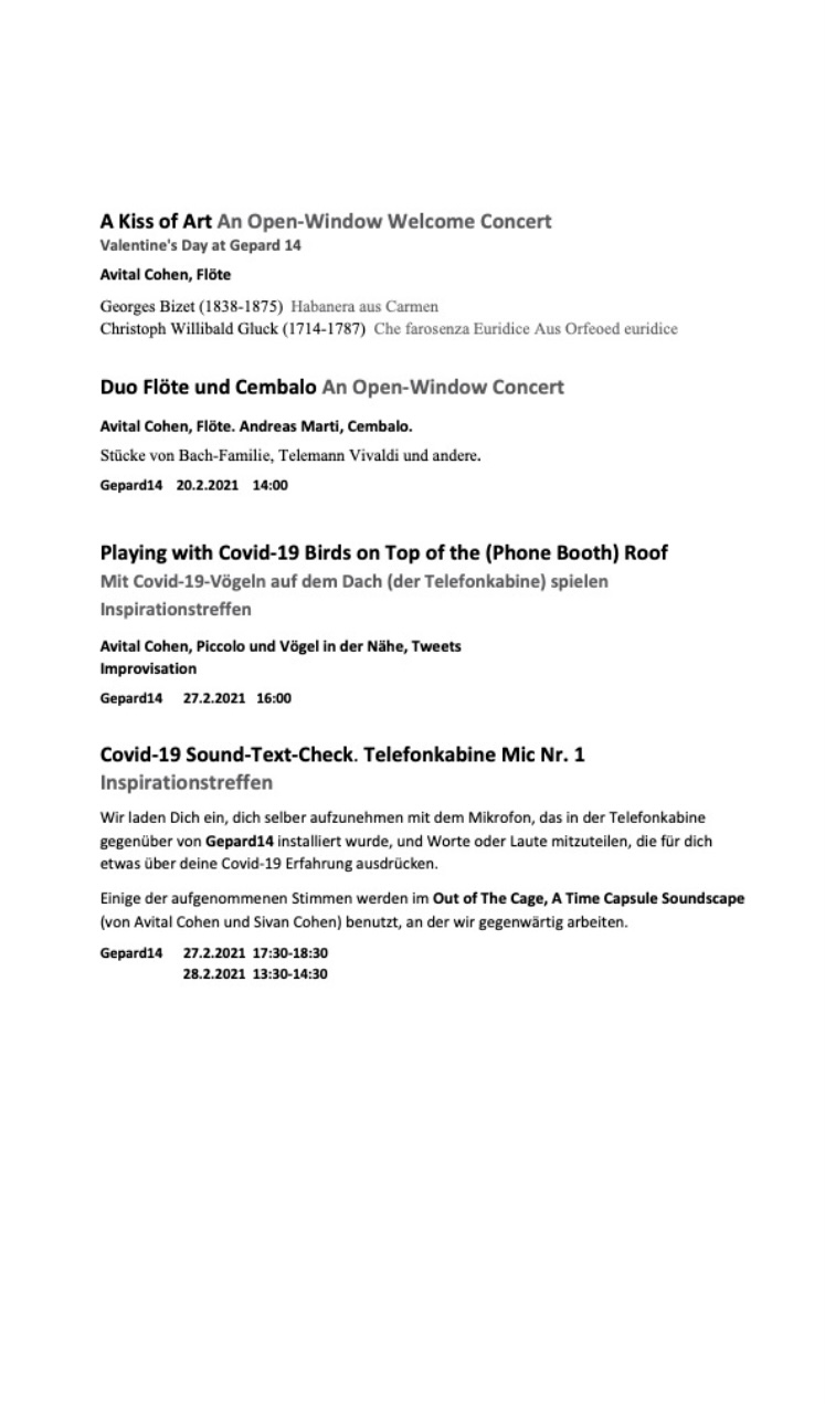 Die erste Serie von AIR POÈTIQUE fand während der Corona-Pandemie statt (siehe: www.avitalcohen.com/projkete), obwohl es seit 2014 ununterbrochen Konzerte und Projekte mit den oben genannten Themen gab, die noch nicht unter diesem Titel waren. Wir haben Konzepte entwickelt, in denen die COVID-Einschränkungen respektiert wurden. Zum Beispiel die Performance: „A flutist calling the show must go on“ (©Avital Cohen & Sivan Cohen) in einer Telefonkabine in Köniz - eine 6-stündige Performance bei 1°C Aussentemperatur. Das Publikum stand mehr als 2 Meter auseinander entfernt auf offener Strasse und viele Familien konnten es durch die Balkone sehen und hören. Andere Konzertreihen während der Pandemie waren: „Birds Mania“, wo wir im Elfenaupark mitten im Wald in einer sonst immer geschlossenen Kapelle ein Cembalo-Flöten-Konzert spielten. Dieses Konzert war so erfolgreich, dass die Gemeinde Muri uns die Schlüssel der Kapelle zur Verfügung stellten und wir dort regelmäßig bei jedem Wetter verschiedene Programme spielten.
