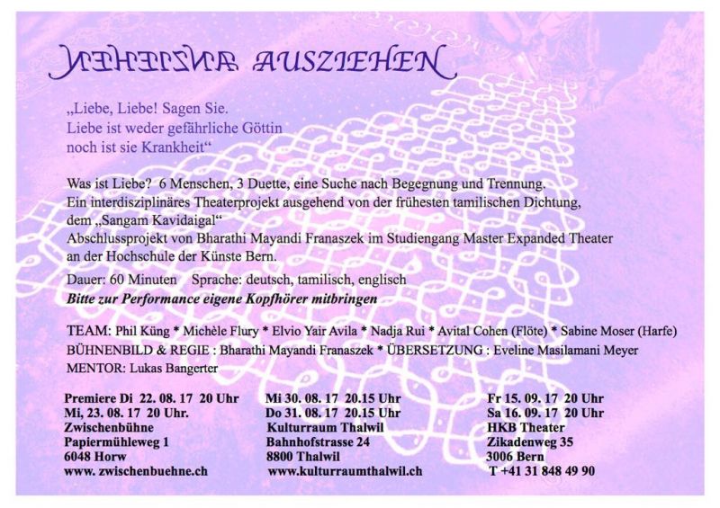 Was ist Liebe? 6 Menschen, 3 Duette, eine Suche nach Begegnung und Trennung. Ein interdisziplinäres Theaterprojekt ausgehend von der frühesten tamilischen Dichtung dem «Sangam Kavidaigal».