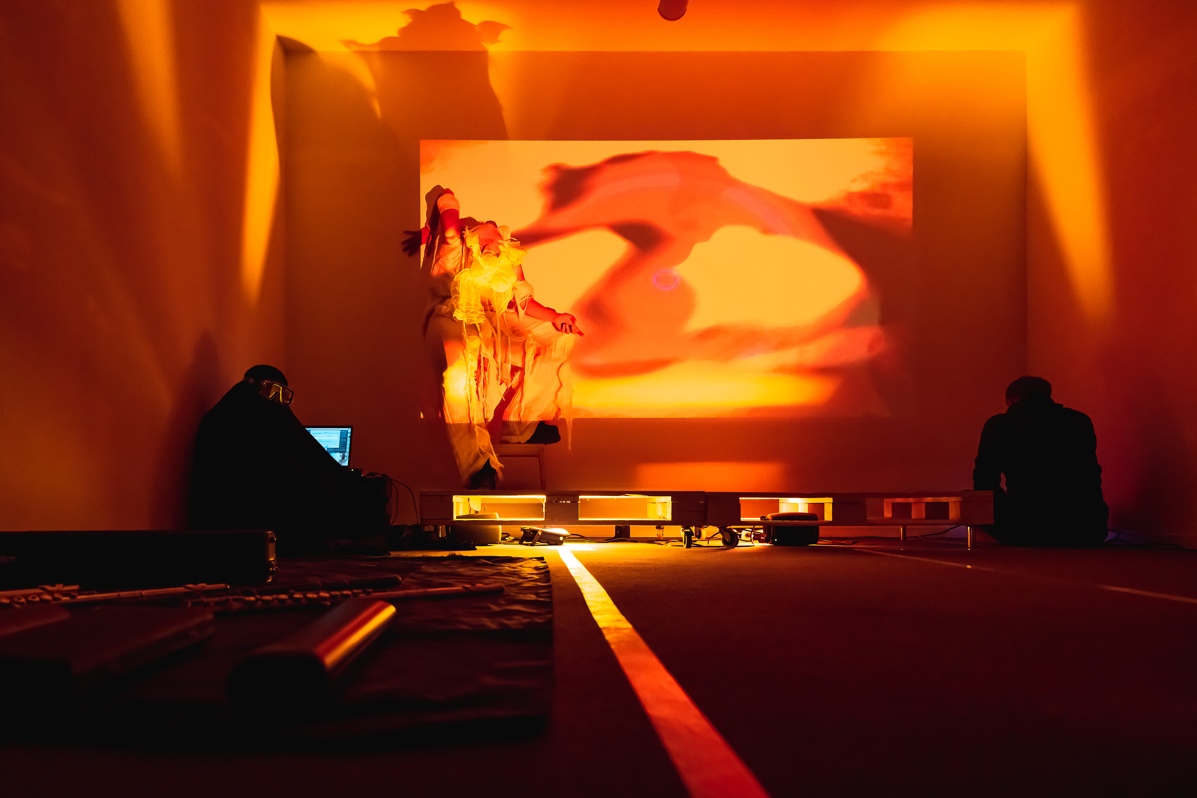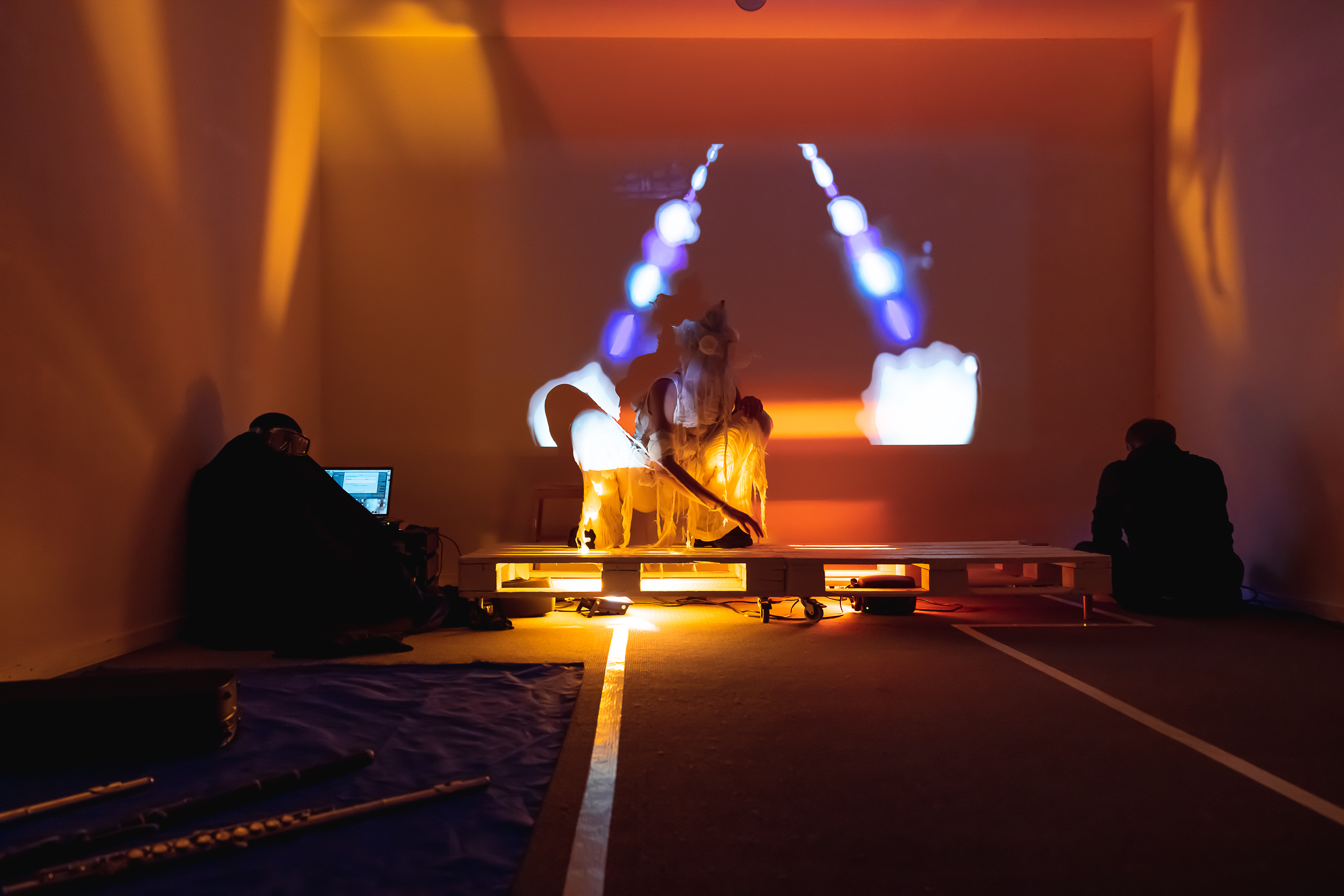 The piece is performed by an invisible flutist playing six different flutes, a composer, VJ and staged in an inquisitive, rather small space for a small audience.
