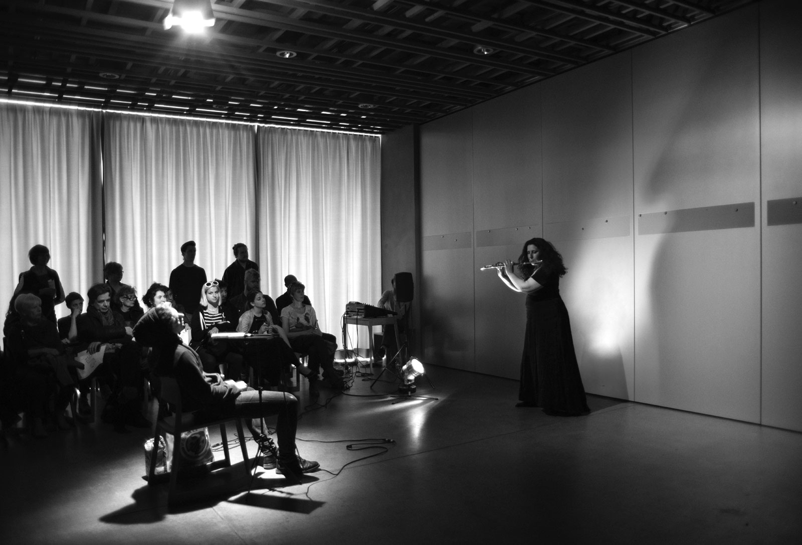The participants are invited to sit down in the middle of a room. They are surrounded by microphones pointing in different directions. The lighting is minimal, as if in a twilight setting. The audience follow the flautist’s playing. She improvises on different flutes and flute mouthpieces, with her own body, various props and with live electronics. Woven throughout the performance are stories of her artistic inspirations, quotations from her life and statements of renown musicians.