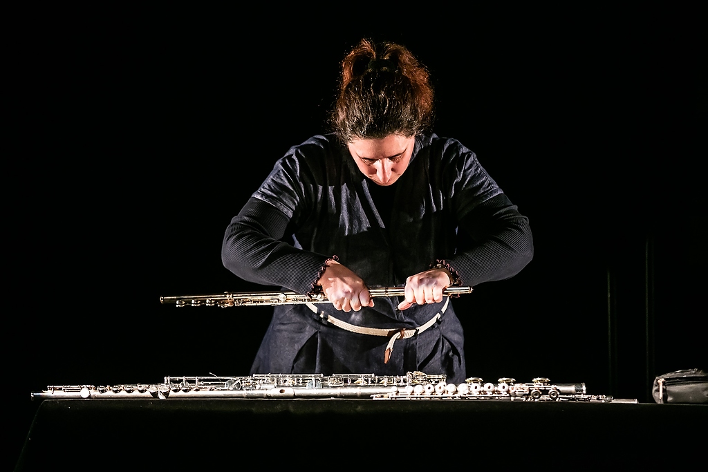 A flautist gasps for breath. She follows the origin of sound in its most exposed forms. She feels the raw, pulsing notes of the past and the present, and she creates a new future. She dissects her musical singularities as well as her musical background. To create her new self-portrait as an artist, she tries to disassemble the limits set down by pre-written notes.